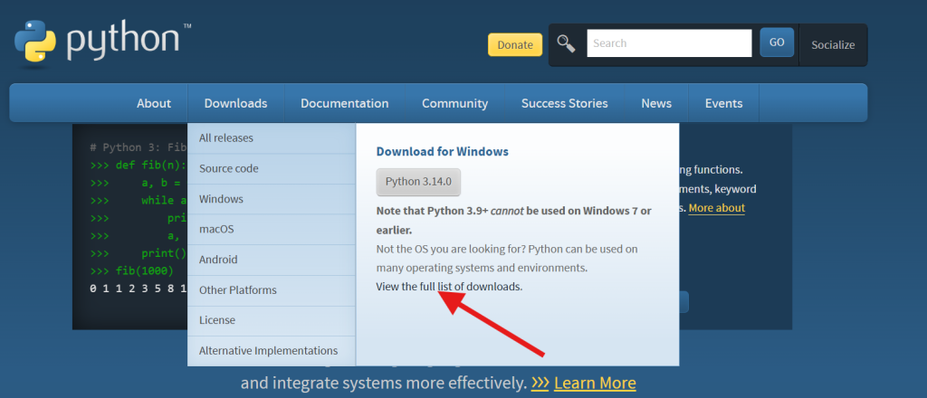Head over to the official Python website: python.org. Hover over the “Downloads” section and click on “View full list of downloads”. This will take you to a page where you can browse and download different Python versions.